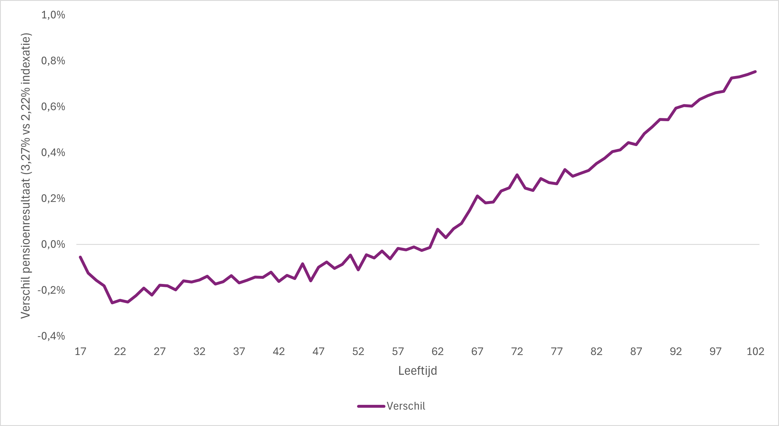 Nu pensioenen verhogen heeft gevolgen in de verdere toekomst. De verhoging zorgt ervoor dat de dekkingsgraad van het fonds daalt. En met een lagere dekkingsgraad wordt de ruimte voor verhogingen of het inhalen van gemiste verhogingen in de toekomst kleiner. Bij de omzetting van de pensioenen naar de nieuwe regels is er straks minder kapitaal te verdelen. Alle effecten hebben we doorgerekend. In de onderstaande grafiek ziet u wat het procentuele effect is van de verhoging op het verwachte pensioen naar leeftijd. Voor een 30-jarige daalt het verwachte pensioen met 0,9%, voor een 50-jarige met 1,2%. En voor een 70-jarige stijgt het verwachte pensioen met 0,6%.